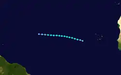 A tropical wave emerged into the Atlantic Ocean from the west coast of Africa on September 10. A weak high-level trough and a warm anticyclone to the east-northeast generated low wind shear,[4] allowing a tropical depression to develop at 18:00 UTC on September 13, while located about 225 mi (360 km) southeast of Praia, Cape Verde.[8] Although satellite imagery indicated a well-defined system, the cyclone did not organize further until the following day, when it became a tropical storm at 06:00 UTC. Upon doing so, Edna quickly gained strength. Early on September 15, the ship Sal Mela observed wind speeds of 69 mph (111 km/h), indicating that Edna was approaching hurricane status.[4] At 00:00 UTC, Edna attained its peak intensity with maximum sustained winds of 70 mph (110 km/h), which it maintained for 18 hours.[8] On the next day, a cold upper-level trough began producing unfavorable conditions, causing Edna to degenerate into a tropical depression by 06:00 UTC on September 17.[4] Edna degenerated into a tropical wave early the following day, while situated about 395 mi (635 km) east of Barbuda.[8]
