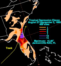 On August 26, a tropical depression developed in the northeastern Gulf of Mexico. Drifting northeastward, the depression was situated offshore Central Florida on August 28, shortly before it trekked southward and made three landfalls in Florida near Clearwater, Holmes Beach, and Venice. By early on August 29, the depression began moving northeast to north-northeastward across the state. Late on August 31, the system emerged into the Atlantic Ocean near Atlantic Beach and dissipated shortly thereafter. Due to the depression's slow movement across Florida,[4] heavy rainfall was observed, including 15.46 in (393 mm) of rainfall in Jacksonville.[15] Considerable flooding was reported in Clay and Duval counties. Along the upper Cedar River in the latter, many homes and businesses were flooded. Eleven bridges were inundated with water ranging from a few inches to 4.5 ft (1.4 m). Peak discharge amounts were higher than during Hurricane Dora in 1964. However, soil moisture and streamflow conditions during Dora were much more conducive to producing floods than antecedent conditions associated with this depression.[20] Further south in Daytona Beach, a tornado destroyed a motel and several homes.[4]