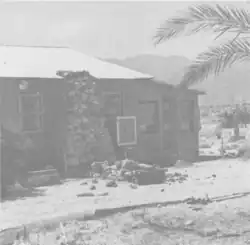 Heavier damage included cracked and fragmented concrete bridge piers. There was minor damage in Ocotillo Wells; the only documented serious damage was to a house that had walls split apart and bedroom detached from the main structure.[21][20] A storage tank beside the house spilled 3,600 gallons of water over the porch, toppling its posts. Ground cracks appeared at the airport and roads. Residents were temporarily without water because of a damaged community well pump. A motel 4.8 km (3.0 mi) west of Ocotillo Wells sustained broken water and sewerage pipes, cracked tiles and its lower floor was flooded by water from the swimming pool. Large transformers 5.1 km (3.2 mi) from Ocotillo Wells were displaced, snapping their anchor bolts and X-bracings.[17]
