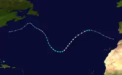 On July 23, a tropical wave emerged into the Atlantic from the west coast of Africa.[13] By 06:00 UTC on July 25, the system developed into Tropical Depression Twelve. Initially, the depression strengthened slowly while moving west-northwestward. Eventually, it was upgraded to Tropical Storm Anna at 06:00 UTC on July 27. Modest intensification ensued during the next 18 hours, after which Anna maintained winds of 60 mph (97 km/h) for nearly two days. At 12:00 UTC on July 30, Anna began to weaken and moved in a more northwesterly direction. By 12:00 UTC on July 31, Anna degenerated into a surface-based trough while situated north of the Lesser Antilles, but continued to produce gale-force winds.[2][4]