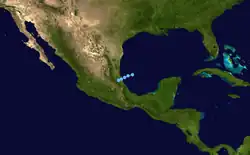 A trough in the western Gulf of Mexico produced an area of thunderstorms. On August 7, a Hurricane Hunters flight observed a circulation, indicating that a tropical depression developed. The system moved southwestward, making landfall near Tuxpan in northeastern Mexico early on August 8. It quickly dissipated after moving ashore.[14]