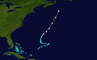 On October 11, 1970, satellite images indicated that a tropical depression developed north of Hispaniola.[1] However, according to post-analysis, a subtropical depression actually formed on October 12 at 1200 UTC. The depression slowly intensified over the next few days, and became a subtropical storm on October 12, thought this was operationally unnoticed by the National Hurricane Center.[2] By October 13, satellite imagery indicated that convection associated with the depression merged with a weak stationary front. As a result, the National Hurricane Center no longer considered it purely tropical and classified the system as a "subtropic storm" on October 14.[1] Later that day, the National Hurricane Center began issuing special bulletins for the storm, indicating the possibility of the system acquiring tropical characteristics.[3]