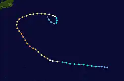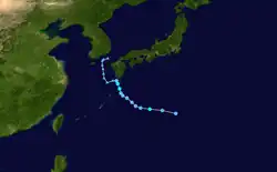 In mid-June a change in the jet stream over a large part of the Pacific Ocean caused an increase in tropical wave frequency; one becoming the precursor to Olga. The wave was first noticed near the Marshall Islands, particularly the Island of Majuro on June 24. As it moved west weather satellites depicted the wave had begun to organize with considerable convection and spiraling storm bands as it neared the Central Caroline Islands. Due to the waves close proximity to a high pressure area to the north, strong easterlies accelerated it to the west. The increased forward speed inhibited the establishment of a circulation until it was south of Guam early on June 29. Later that day reconnaissance found a closed center and gale-force winds, prompting the JTWC to upgrade the low into a tropical storm and was given the name Olga. As it entered the Philippine Sea the ridge that had kept it to the south began to weaken allowing Olga to move in a northwestward direction. As Olga entered an increasingly favorable environment, the storm slowed its forward speed and strengthened into a typhoon late on June 29. Rapid intensification followed as the system bottomed out at a pressure of 904 hPa (26.7 inHg) and winds of 160 mph (260 km/h) on July 1.[3] The rapid 62 millibar drop between June 30 and July 1 caused an intense wind profile surrounding the small eye. The storm followed a break in the ridge and moved north while gradually weakening. As Olga was passing to the east of Taiwan a short wave from the China mainland gave an eastward component to the storm's motion. A low developed following the short wave and began to influence Olga, causing the typhoon to weaken. Dry air soon entered the circulation, reducing the systems overall convection. During July 5 Olga made landfall on the Kansai region of Japan, south of Osaka, as a tropical storm. The system continued into the Sea of Japan, and merged with a cold front. The remaining low tracked over South Korea before completely dissipating on July 7.[2]