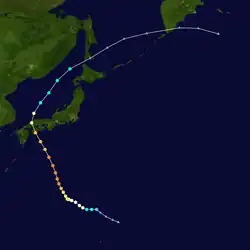 Typhoon Billie formed in the Philippine Sea as a weak depression. It intensified while heading northwards, becoming a tropical storm on the 23rd, a typhoon on the 25th, and reaching its maximum intensity of 110-knot winds and a 945-millibar central pressure as it passed the Ryukyu Islands on the 27th. The storm brushed South Korea as a category-1-equivalent typhoon on the 29th before making landfall in North Korea on the 30th.[2] The remnants of Billie dissipated over the Sino-Soviet border shortly after.