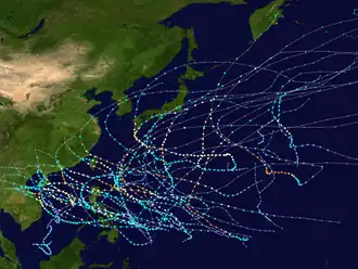Note: Data begins at the year 1955 due to earlier data being increasingly unreliable. Totals for tropical storms and typhoons after 1964 are from the Japan Meteorological Agency, and totals for the unofficial super typhoon category are from the Joint Typhoon Warning Center.