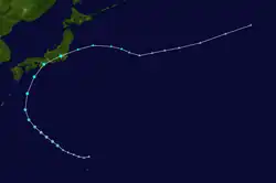 During January 8, the JMA started to monitor a tropical depression that had developed, about 500 km (310 mi) to the east of Ngerulmud, Palau.[3] Over the next day the system gradually developed further as it moved north-westwards, before it was classified as a tropical storm and named Sarah by the JTWC, after a US Navy plane had found an organised system.[3][4] The system subsequently recurved north-eastwards, before it was classified as a Severe Tropical Storm by the JMA during January 10.[5] During that day, the JTWC reported that the system had peaked, with 1-minute sustained wind-speeds of 95 km/h (60 mph).[4] Over the next day, the system quickly weakened and became an extratropical cyclone during January 11.[4] Sarah's extratropical remnants were subsequently tracked as they moved north-eastwards, until it made landfall on Canada and broke up over the mountains of British Columbia during January 17.[4]