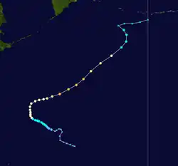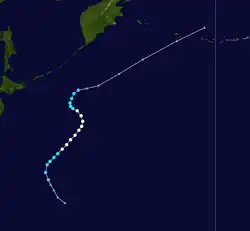 A tropical disturbance developed on January 8 to the southwest of Palau.[1] By the next day, the disturbance was upgraded to a tropical depression and to a tropical storm. Wanda reached its peak intensity on January 10 as a 65 mph tropical storm. The storm was then downgraded to a tropical depression on January 11. Wanda then dissipated on January 14.[3]