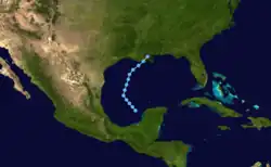 On November 8, Tropical Depression Twenty-One developed off the coast of Honduras. Moving north-northwestward, the system gradually intensified. Between November 9 and 10, reconnaissance missions into the depression found winds of 40 mph (64 km/h); however, the NHC did not upgrade it to a tropical storm, because weaken occurred shortly thereafter. Over the following few days, the system gradually turned southward and made landfall in the southwestern edge of the Yucatán Peninsula on November 12, shortly before dissipating.