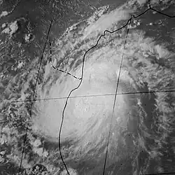 Doris made meteorological history when, on August 31, it became the first Atlantic hurricane ever to be upgraded to hurricane intensity solely on the basis of satellite pictures,[1] via the Dvorak technique.[7] The cyclone then curved northward and intensified further during the next few days, becoming a Category 2 hurricane early on September 2.[3] Based on the Dvorak technique, it is estimated that Doris peaked with maximum sustained winds of 110 mph (180 km/h) and a minimum barometric pressure of 965 mbar (28.5 inHg) shortly thereafter. By September 3, the hurricane began interacting with a non-tropical low pressure area.[7] On the following day, Doris quickly weakened to a tropical storm and transitioned into an extratropical cyclone about 830 mi (1,340 km) south-southeast of Cape Race, Newfoundland, around 06:00 UTC. The extratropical remnants weakened and then dissipated late on September 4.[3]