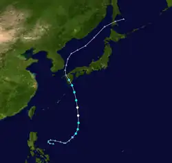 The monsoon trough spawned Tropical Depression 7W on June 20. It headed westward, slowly organizing into a tropical storm on the 23rd. Ruby turned to the northwest, and reached typhoon strength just before hitting Luzon on the 25th. It crossed the island, weakening to a tropical storm before turning to the northeast in the South China Sea. Ruby again became a typhoon on the 28th, and on July 2, the typhoon reached a peak of 140 mph (230 km/h) winds while south of Japan. The typhoon turned to the east, and became extratropical on the 3rd. 16 people were killed from the typhoon.