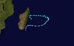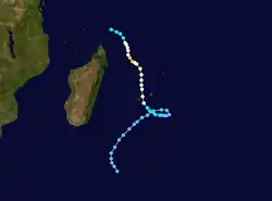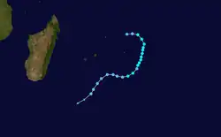 Celine existed from January 31 to February 12. Celine looped near Mauritius while intensifying, and later passed just north of Rodrigues. Wind gusts on the latter island reached 216 km/h (134 mph).[3] The storm killed about half of the population of the critically endangered Rodrigues flying fox.[4]