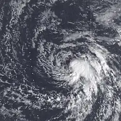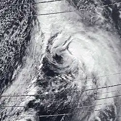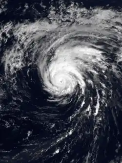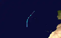 Six hours after being named, Irma reached its peak intensity of 50 mph (80 km/h).[64] On October 5, Irma turned towards the north-northeast and passed about midway between the central and western Azores.[62] Shortly thereafter, Irma became less organized,[65] and that evening was absorbed into an approaching cold front, about 450 mi (720 km) northeast of the Azores.[66] Although Irma passed near parts of the western and central Azores with gale-force winds in some areas, no reports of damage or casualties caused by Irma were received. Several nearby ships reported winds around 46 mph (74 km/h). It was noted that heavy rains may have occurred on some of the mountainous islands as Irma passed.[62]