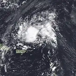 After peaking with maximum sustained winds of 50 mph (80 km/h) and a minimum barometric pressure of 1,006 mbar (29.7 inHg) early on October 9, Juliet passed north of Puerto Rico.[67] The storm brought light rainfall to the island, peaking at 4.51 in (115 mm) at Toro Negro Plant.[19] The storm then accelerated and curved northwestward, northward, and then northeastward. On October 11, Juliet merged with a frontal zone, while located west-southwest of Bermuda. Later that day, the remnants moved across the island and produced up to 3 in (76 mm) of rainfall.[67]