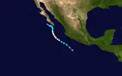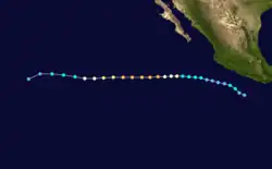 A small disturbance coincident with a tropical wave was first identified south of Acapulco on August 19.[4][5] The system moved west and coalesced into a tropical depression around 18:00 UTC on August 23.[6] The depression failed to intensify over subsequent days, and in fact, it was operationally downgraded back to a disturbance on August 26.[5] In the official database, the cyclone maintained its status and eventually intensified into Tropical Storm Miriam around 00:00 UTC on August 27.[6] Miriam turned west-southwest and entered the Central Pacific,[5] where it intensified into a hurricane at 12:00 UTC on August 28 and reached peak winds of 90 mph (140 km/h) twelve hours later.[6] Miriam then began to steadily weaken as it passed south of Hawaii,[5] and the cyclone dissipated after 00:00 UTC on September 2.[6]
