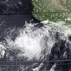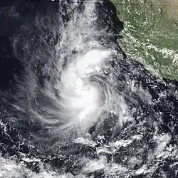 An area of disturbed weather southeast of Socorro Island became a tropical storm on October 28. It headed northeast and approached the coast of Mexico. However, an area of high wind shear and cool waters destroyed the cyclone on October 29, before it could reach the coast.[2] Newton was the tropical cyclone that came closest to making landfall this season. However, no impact was reported.[2]