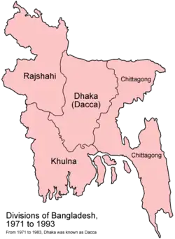In 1980, Bangladesh was administratively divided into 4 divisions, namely Dhaka, Chittagong, Khulna and Rajshahi which were further subdivided into a total of 18 districts (See List of districts of Bangladesh). On 23 December 1982 the Local Government (Thana Parishad and Thana Administration Reorganisation) Ordinance was promulgated to introduce major changes with respect to the system of local government at the thana level. Under the reorganised set-up, thana was designated as the focal point of administration. In 1983, the Local Government Ordinance of 1982 was amended to re-designate and upgrade the existing thanas as upazilas (sub-districts).[4] Furthermore, during 1983–84, 46 new districts were created by upgrading them from thanas or upazilas. By the end of the decade the number of districts stood at 64.