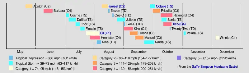 The first storm of the season, Hurricane Adolph, became the southernmost-forming east Pacific tropical cyclone on record after forming at a latitude of 7.1°N. After a slow start, activity picked up in July, when Hurricane Gil moved through the Hawaiian Islands, resulting in minor damage. In early August, Hurricane Ismael was responsible for three deaths and $19 million (1983 USD) in damage in the United States. In September, hurricanes Kiko and Lorena brought significant damage and seven deaths to southern Mexico. About a month later, Tropical Storm Octave became the worst tropical cyclone on record to affect Arizona. Octave killed 15 people, and caused $500 million in damage to Arizona and $12.5 million to New Mexico. Later in October, Hurricane Tico was a very intense hurricane at the time of its landfall and thus left 25,000 homeless. Damage throughout the country was estimated at $200 million while 135 deaths were reported in Mexico. Although most of its impact occurred in Mexico, Tico's remnants brought significant flooding in the Central United States, resulting in six deaths and $42 million in damage. A few days later, Hurricane Raymond posed a threat to Hawaii, but did little actual damage. The final storm of the season, Hurricane Winnie, was a rare December cyclone.