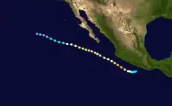 The origins of Hurricane Ismael were from a northward bulge of the Intertropical Convergence Zone (ITCZ) in early August, which resulted in the formation of a tropical depression on August 8. Six hours later, it was upgraded into Tropical storm Ismael. Continuing to intensity, Ismael was upgraded into a hurricane late on August 10 and subsequently developed an eye. The storm soon reached its peak of 100 mph (155 km/h). Late on August 11, Hurricane Ismael began to weaken as it encountered cooler waters and the hurricane was soon downgraded to a Category 1 on the SSHWS. The following day, Ismael was downgraded into a tropical storm about 380 mi (610 km) west of the Baja California peninsula. On August 14, the storm was downgraded into a tropical depression while centered about 250 mi (400 km) west of Point Ensenada.[7] Ismael dissipated that day.[3]