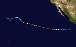 During the 1983 season, a total of 21 named storms formed,[3] which was well-above the long-term average of 15.[4] However, this total was slightly less active than the 1982 Pacific hurricane season, which saw a then-record 22 storms form.[5][6] However, 1983 was at that time the most active season in the Eastern Pacific Hurricane Center (EPHC) warning zone,[7] but this record itself was surpassed during the 1985 Pacific hurricane season,[8] and again in the 1992 Pacific hurricane season.[9] Additionally, 12 storms reached hurricane intensity, which was above the average of eight.[7] Of the 12 hurricanes, eight attained Category 3 intensity or higher on the SSHWS.[4] The season started on May 21 with the formation of Adolph and ended on December 9, with the dissipation of Hurricane Winnie. Lasting 201 days, 1983 was the longest season on record. There were a total of 1,238 storm hours, which was the most in four years.[7] Despite the activity in the EPHC's warning responsibility, only two storms formed in the Central Pacific Hurricane Center (CPHC)'s area of responsibility, both of which stayed depressions.[10] A moderate El Niño was present throughout the season, with water temperatures across the equatorial Central Pacific was nearly 5 °F (0.6 °C) above normal.[11] The Pacific decadal oscillation (PDO) was in a warm phase during this time period.[12] Both of these factors are known to enhance Pacific hurricane season activity. Furthermore, 1983 was in the middle of an era where all but the 1988 Pacific hurricane season was near or above average.[13]