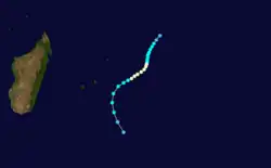 Well away from land, the JTWC reported that a tropical disturbance developed on January 1. Initially, the storm remained weak, but later on January 11, the JTWC noted that the system had intensified into a tropical storm. Continuing to intensify, the storm moved towards the southwest. On January 12, MFR first classified the system; within six hours, it was declared a moderate tropical storm. As Celestina made a turn towards the south-southwest, MFR estimated that Celestina attained peak intensity as a severe tropical storm at 0600 UTC on January 13. According to the JTWC, the storm briefly developed hurricane-force winds; however, Celestina began to weakened thereafter. Moving south, Celestina was situated roughly 350 mi (565 km) east of Madagascar. Furthermore, on January 15, Celestina briefly re-intensified while undergoing a counterclockwise loop. By January 18, Celestina resumed a weakening trend; by that night, MFR downgraded the system into a tropical depression as it was now moving south-southwest. The storm was re-upgraded into a moderate tropical storm three days later, on January 21. However, this trend was short lived and that evening, the JTWC stopped monitoring the system. MFR followed suit at 0600 UTC on January 23.[6] During its lifetime, Severe Tropical Storm Celestina brought rains to Reunion, peaking at 600 mm (25 in) in Trois-Bassins.[16]