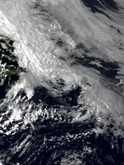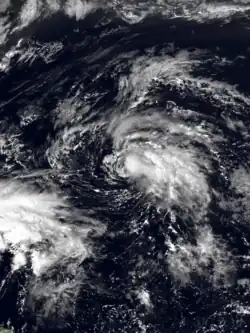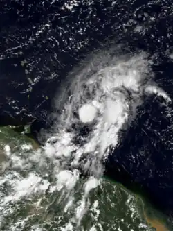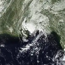 The origins of Tropical Storm Edouard are unclear, but an area of persistent organized storms formed in the Bay of Campeche, which strengthened into a tropical storm on September 14. Edouard rapidly intensified, with wind speeds reaching 65 miles per hour (105 km/h) in 18 hours as a faint eye feature became visible. Following its strengthening, Edouard dissipated even more quickly, degenerating into an area of thunderstorms the next day.[36] The remnants of Edouard moved over land near the port of Veracruz.[37]