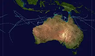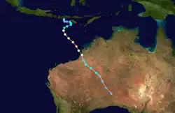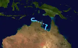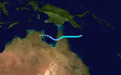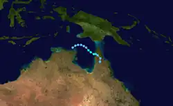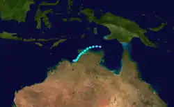 On 9 April, the BoM started to monitor a weak tropical low that had developed within the Gulf of Papua, to the west of Port Moresby in Papua New Guinea.[19][20] Over the next couple of days, the system moved south-westwards through the Torres Strait and over the southern Arafura Sea, however, it remained poorly organised, which made it hard for the BoM to track the system and assess its intensity.[19][21] During 11 April, the JTWC initiated advisories on the system and designated it as Tropical Cyclone 34S, before they reported that the system had peaked as a tropical storm with 1-minute sustained windspeeds of 85 km/h (50 mph).[3][21] During the following day, TCWC Darwin reported that the system had become a tropical cyclone and named the system Gretel, after they had received various reports of gale-force winds from ships.[19][20]
