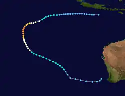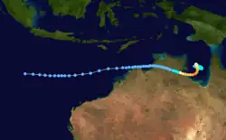 Cyclone Margot was a tropical cyclone that stayed out to sea during its entire duration. It was first identified on 10 April, off the coast of Sunda Strait. Margot then traveled to the southwest during 12 April, gradually intensifying to a tropical cyclone. In the noon hours of 13 April, it began to move to the southeast, under the influence of an intense high-pressure area to the south. The cyclone reached a peak intensity on 14 April, as a category three cyclone using the Australian scale, with winds of 155 km/h (95 mph). This intensity was based on satellite estimates, but the strongest report was from a ship eighteen hours earlier. After peak intensity Margot gradually weakened up until the 19, when it briefly underwent intensification, and turned west. This was short lived however, as dry, easterly low-level winds and wind shear began to influence the cyclone. Margot began to rapidly weaken and move in an easterly direction on 20 April. On the 21 Margot had become a remnant low after completing a figure-eight path. On the 25 the remnant low was absorbed by a broad low-pressure system located in the northeast Indian Ocean.[18]