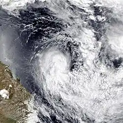 The system subsequently accelerated south-eastwards, before the BoM reported that Pierre had peaked as a Category 2 tropical cyclone with 10-minute sustained winds of 95 km/h (60 mph) during 21 February.[6][7] Later that day, the system made landfall in Shoalwater Bay and weakened below tropical cyclone intensity, before it moved back into the Coral Sea near Yeppoon.[6][7] Pierre subsequently moved almost due eastwards, before it was last noted during 24 February as it moved out of the Australian region and into the South Pacific basin.[6][7] As Pierre moved south-eastwards parallel to the Queensland coast, it produced high seas, gale-force winds, minor flooding and minimal damage.[6][8]