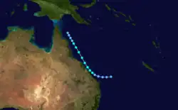 During the middle of January, an ill-defined tropical low formed within the Intertropical Convergence Zone, near the Cape York Peninsula and moved eastwards into the Coral Sea.[2] Over the next few days, the system moved eastwards into the Coral Sea, before its circulation became better defined during 14 January.[2] The system continued to move eastwards over the next couple of days, before the JTWC initiated advisories on the system and designated it as Tropical Cyclone 13P on 16 January. [3] Later that day, as the system approached 160°E and the South Pacific basin, TCWC Brisbane reported that the low had become a tropical cyclone and named it Nigel.[2][4] The newly named system subsequently moved out of the Australian region later that day, with 10-minute sustained winds of 110 km/h (70 mph), which made it a Category 2 tropical cyclone on the Australian scale.[2][4] Nigel caused no damage while located within the Australian region, however, the system later caused significant impacts to Fiji and Vanuatu.[2][5]