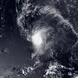 First spotted as a tropical disturbance near the Lesser Antilles on November 15, the system moved generally northward while slowly developing. The system organized into a tropical depression on November 18 and quickly strengthened into a tropical storm. The storm curved northeast and strengthened further, reaching hurricane strength on November 20. However, a surface high-pressure system to the north caused the storm to weaken as the vertical wind shear increased over its center. Frances was later absorbed by an extratropical cyclone on November 21.[38]