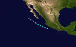 A tropical disturbance developed on September 27 within 250 mi (400 km) of the Mexican coastline.[2] The disturbance was upgraded into Tropical Depression Twenty-Three on 0000 UTC September 28. Tropical Depression Twenty-Three moved west-northwestward, lured poleward by an upper-level trough near northern Mexico. At 0000 UTC September 30, the depression became Tropical Storm Paine, southwest of Acapulco. Roughly 21 hours later, a NOAA Hurricane Hunter flight found winds of 90 mph (140 km/h), upgrading Paine into hurricane. The hurricane peaked as a Category 2 hurricane on October 1 as it turned northwest, headed towards the Gulf of California. Hurricane Paine did not intensify further due to the presence of mid-level wind shear and dry air.[2] The outer eyewall moved across Cabo San Lucas, and the resultant land interaction was believed to have slightly weakened the inner core of the hurricane.[31] Paine moved ashore near San José, Sonora with winds of 100 mph (160 km/h). The storm weakened as it moved over land going through Mexico and then entering the United States. Paine dissipated on October 4 over Lake Michigan.[2][32]