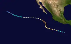 Activity in the Eastern Pacific Hurricane Center's (EPHC) area of responsibility was above average. There were 25 tropical depressions, one short of the record set in 1982, which had 26.[2] Only one system formed in the Central Pacific Hurricane Center's (CPHC) area of responsibility, and six others entered the CPHC area of responsibility from the EPHC area of responsibility.[3] In all, 17 systems formed, which is two storms above normal. In addition, 9 hurricanes were reported during the season, one more than average. An average number (3) of major hurricanes – Category 3 or higher on the Saffir-Simpson hurricane wind scale—was also reported.[4][5]