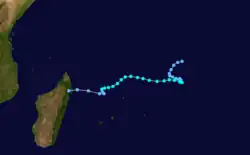On January 22, a tropical disturbance formed to the southeast of Diego Garcia.[13] It moved generally to the west-southwest, intensifying into a tropical storm on January 23. That day, the Mauritius Meteorological Services named the storm Doaza,[14] and the JTWC classified it as Tropical Cyclone 09S.[2] On January 25, Doaza passed north of Tromelin Island,[14] and around that time it attained an initial peak of 80 km/h (50 mph).[13] Later that day, the storm struck eastern Madagascar near Île Sainte-Marie, and it quickly weakened over land,[14] so much so that the JTWC discontinued advisories.[2] However, Doaza emerged into the Mozambique Channel on January 26 near Mahajanga and soon after reorganized while curving to the south.[14] The JTWC again issued advisories on January 28,[2] around which time Doaza passed just southeast of Juan de Nova Island. On the next day, the storm attained tropical cyclone status, reaching winds of 135 km/h (84 mph) just west of Europa Island. On January 30, the JTWC estimated peak 1 minute winds of 215 km/h (134 mph), by which time the storm was moving due southward.[13] Doaza turned to the southeast and quickly weakened, dissipating within the westerlies on February 1.[14]