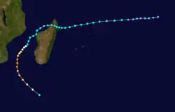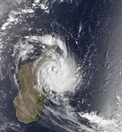 During the season, the Météo-France office (MFR) on Réunion island issued warnings in tropical cyclones within the basin. Using satellite imagery from National Oceanic and Atmospheric Administration, the agency estimated intensity through the Dvorak technique, and warned on tropical cyclones in the region from the coast of Africa to 90° E, south of the equator. The World Meteorological Organization recognized the MFR as a Regional Tropical Cyclone Advisory Centre in 1988, and would later label the agency as a Regional Specialized Meteorological Center in 1993.[1] The Joint Typhoon Warning Center (JTWC), which is a joint United States Navy – United States Air Force task force, also issued tropical cyclone warnings for the southwestern Indian Ocean.[2] The season's nine named storms is equal to the long term average, while the five tropical cyclones – a storm attaining maximum sustained winds of at least 120 km/h (75 mph) – was slightly below average.[3] The MFR considered the tropical cyclone year to begin on August 1 and continue to July 31 of the following year.[1]