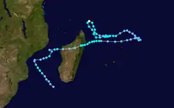 The MFR continued tracking the circulation, and Hely turned back to the west on March 24 due to a strengthened ridge following Gasitao's dissipation. On the next day, it briefly re-intensified into a tropical storm, only to weaken to tropical depression status again on March 26. Moving toward Madagascar, Hely passed north of Tromelin and again became a tropical storm on March 27,[26][27] the same day that the JTWC reissued advisories.[2] Later that day, the storm made landfall just north of Île Sainte-Marie, and it weakened once again over land.[27] Wind gusts in Madagascar reached 80 km/h (50 mph).[15] On March 29, the storm emerged into the Mozambique Channel near Besalampy, and failed to re-intensify significantly as it moved southwestward. Two days later, Hely turned sharply to the southeast, sparing it moving ashore Mozambique. The MFR ceased tracking the system as a tropical cyclone on April 2, although the circulation was still visible as late as April 5, 21 days after it originated.[26][27]