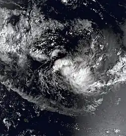 Two circulations became evident in the central Indian Ocean in the middle of March, the westernmost which would become Tropical Storm Hely. The eastern one would become Tropical Cyclone Gasitao, which was first originating on March 12 to the east of Diego Garcia. On March 15, it developed into a tropical storm about 700 km (430 mi) to the south-southeast of Diego Garcia while moving on a west-southwest trajectory.[23][24] On March 16, the Mauritius Meteorological Services named it Gasitao,[23] the same day that the JTWC classified it as Tropical Cyclone 16S.[2] By that time, the storm was moving more to the west as it gradually intensified.[24]