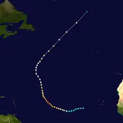 A well-organized disturbance moved off the African coast on September 6 and rapidly developed into Tropical Depression Eleven. The NHC began issuing advisories on September 8 while it was 350 mi (560 km) northeast of Cape Verde. An after-the-fact review of satellite and ship reports indicated that the depression reached tropical storm-strength on September 7.[44][45] However, because of its extreme eastern track, the storm's observational track did not include this information.