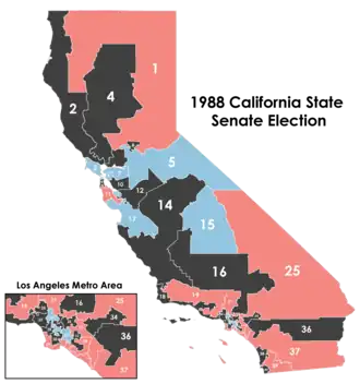 The 1988 California State Senate elections were held on November 8[1] in the twenty odd-numbered Senate districts. There was no change to the representation of the Democratic and Republican parties.