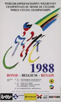 The 1988 UCI Road World Championships took place in Ronse, Belgium. As this was an Olympic year all the Olympic cycling events served as World Championships, leaving just the Professional road race and the Women's Team Time Trial to be contested. The men's road race was decided in a sprint involving three riders, Maurizio Fondriest, Claude Criquielion and Steve Bauer. 200 meters from the uphill finish, Bauer began the sprint and Fondriest was unable to respond. However, Bauer realised his gear was too heavy, quickly sat down, and shifted down gear. As a result, his speed temporarily dropped, and Criquielion accelerated to the right of Bauer, close to the barriers.