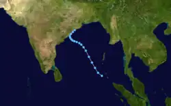 On December 14, the IMD reported that a depression had developed within the Intertropical Convergence Zone over the southern Bay of Bengal.[9] Over the next day the system moved north-westwards and gradually developed into a cyclonic storm, as the JTWC initiated advisories on the depression and assigned it the designation Tropical Cyclone 04B.[9][2] The system subsequently continued to intensify, as it recurved and moved through a break in the subtropical ridge of high pressure.[7][2] Late on December 16, the JTWC reported that the cyclone had peaked as a tropical storm, with 1-minute wind speeds of 85 km/h (55 mph).[12] Early on December 17, the IMD reported that the system had peaked as a Severe Cyclonic Storm with 3-minute wind speeds of 100 km/h (60 mph).[9] The system subsequently started to weaken later that day, as it encountered increasing upper-level wind shear associated with the mid-latitude westerlies.[2] During the next day the system weakened into a Cyclonic Storm, before it degenerated into a depression.[9] The system subsequently made landfall on Bangladesh near Cox's Bazar, before it was last noted over Myanmar by the JTWC during December 19.[9][12] The system caused some deaths and damages in both Bangladesh and Myanmar.[4]