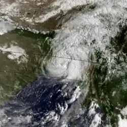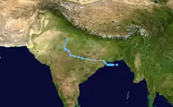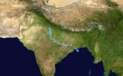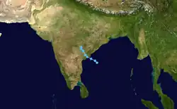 During July 27, a depression developed over the northern Bay of Bengal to the east of the Indian state of Odisha.[2][4] Over the next day the system moved westwards and developed into a Deep Depression, as it made landfall near Badudebpur in Odisha with estimated winds of 55 km/h (35 mph).[4] The system dissipated over East Rajasthan during July 31, as it enhanced monsoon activities over northern and eastern India.[4]