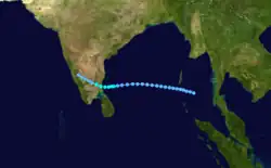 During January 14, the JTWC started to monitor an area of convection that had developed within the near equatorial trough of low pressure, about 900 km (560 mi) to the southeast of Colombo, Sri Lanka.[3][7][8] Over the next couple of days the disturbance moved towards the northwest under the subtropical ridge of pressure, before early on January 17, the JTWC noticed a steady increase in deep convection and issued a Tropical Cyclone Formation Alert.[3] Later that day the JTWC initiated advisories as the disturbance had intensified into a tropical storm and designated it as Cyclone 01A.[3][7] As the Cyclone was suffering from being in an area of strong vertical wind shear it was not able to intensify past minimal tropical storm strength of 65 km/h, (40 mph).[3][7] During the next couple of days, strong upper-level winds stripped deep convection away from the center with the JTWC downgrading the cyclone to a tropical depression early on January 19.[3] The remaining low level circulation center slowly dissipated with the JTWC issuing their final advisory early the next day.[3]