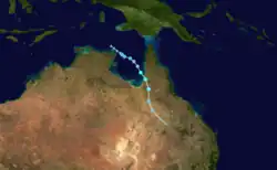 During 29 January, the BoM reported that a tropical low had developed within the monsoon trough, to the north of the Gove Peninsula in the Northern Territory.[7][8] During that day the low rapidly developed further as it moved south-eastwards, before early on 29 January the BoM's TCWC Darwin reported that the low had developed into a category 1 tropical cyclone and named it Sadie as the system started to move southwards.[7] Later that day the JTWC initiated advisories on Cyclone Sadie and designated it as Tropical Cyclone 14P, while the system started to move towards the east and was near its peak 1-minute maximum sustained windspeeds of 85 km/h (50 mph).[7][9][10] Early the next day Cyclone Sadie made landfall to the north of near Normanton, after the BoM had reported that the system had peaked with 10-minute maximum sustained winds of 85 km/h (50 mph).[7][8][10] After making landfall, the system moved towards the south-southeast before weakening and degenerating into a tropical low/rain depression later that day.[7]