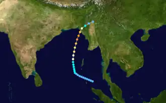 Steered by a ridge to the northeast, the storm tracked north-northwestward at first, before turning northeastward while rounding the ridge. Late on April 30, the JTWC upgraded the storm to the equivalent of hurricane status, with sustained winds estimated at 120 km/h (75 mph). A day later, the IMD upgraded the storm to a very severe cyclonic storm, by which time the eye had become better organized. The agency upgraded it to an extremely severe cyclonic storm on May 2 as the storm neared the northeast coast of the Bay of Bengal. That day at 06:00 UTC, the JTWC estimated peak winds of 230 km/h (145 mph), but the agency assessed that the cyclone subsequently weakened. At 12:00 UTC on the same day, the IMD estimated peak winds of 215 km/h (135 mph). As the storm neared the Bangladesh coast, the storm was tracked by radar, with the eye diameter estimated at 30 km (19 mi). At around 17:00 UTC on May 2, the cyclone made landfall in southeastern Bangladesh about 30 km (19 mi) north of Teknaf Upazila. The storm rapidly weakened over land while continuing northeastward into Myanmar. The JTWC and IMD discontinued advisories by May 3.[1][2]