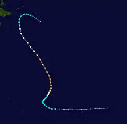Page moved on a northwestward track for the next couple days while slowly strengthening.[11] Page was upgraded to a tropical storm by the JTWC late on May 12,[12] when it was located 500 kilometres (310 mi) north of Yap,[4] while the JMA first considered the system a tropical storm on May 13.[7] Late on May 13, Page suddenly slowed in forward speed and began turning to the northeast. On May 14, Page became a typhoon.[11][12] However, the JMA did not follow suit until 30 hours later.[7] Page reached its maximum intensity of 90 knots (170 km/h) and minimum pressure of 965 hectopascals (28.5 inHg) thirty hours after passing the point of recurvature.[11] Final warnings were issued by both the JTWC[11] and the JMA[7] early on May 18, as it began extratropical transition around 960 kilometres (600 mi) east-southeast of Tokyo.[11]