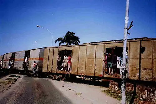 Example of a 1990s Benguela railway freight train with fare-dodgers