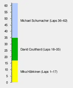 This remained unchanged until both drivers made pitstops for fuel and tyres. Schumacher stopped earlier and for a shorter time than Coulthard allowing him to take over the lead from the McLaren driver. Schumacher then gradually expanded his lead to a maximum of about 23 seconds before making a second pit stop. He was able to stay in first place and thereafter comfortably retained his position to secure his first win of the season.[2][3]