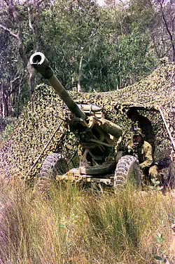 The regiment served two tours in New Guinea. The first began in September 1942 when the regiment supported the 16th Brigade during the final stages of the Kokoda Track campaign, while other elements of the regiment took part in the Battle of Buna–Gona and the defence of Wau.[6] During this time, the regiment expanded existing doctrine for the deployment of artillery by deploying guns into forward areas by air. The regiment returned to Australia for reorganisation in August 1943, and did not see action again until late in the war. It returned to New Guinea in January 1945 to support operations in the Aitape–Wewak campaign, supporting the defence of the airfield around Aitape, the advance on Wewak and operations around Mount Shiburangu.[7] The regiment was in occupation of these areas when the war ended on 15 August 1945. The last of the regiment returned to Australia in January 1946 and was disbanded several weeks later as part of the post war demobilisation.