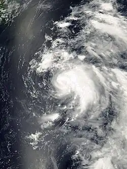 On July 13 a cluster of thunderclouds grouped together to form a low pressure area. On July 14 it started to organize and slowly became a tropical depression on July 19, and quickly intensified into a tropical storm. On July 22 convection was displaced to south of the storm's center due to high wind shear, and caused it to dissipate.