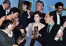 Honorary César recipient Agnès Varda (bottom left) with Agnès Jaoui (centre) and Jean-Pierre Bacri (right), winners for the Best Original Screenplay or Adaptation award